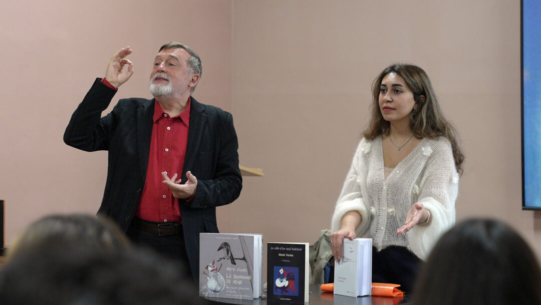 Հայերեն են թարգմանվել դրամատուրգի «Վերջին Գոդոն», «Ինչպես խխունջին վարժեցրի ստինքներիդ», «Չեխով մաքինա», «Նինա կամ հարդալից ճայերի փխրունության մասին», «Արևմտյան ճեպընթաց» պիեսները: Հանդիպման ընթացքում ուսանողները հարցեր են ուղղել դրամատուրգին՝ փորձելով բացահայտել փորձելով բացահայտել նրա ստեղծագործական մտածողության առանձնահատկությունները, կերպարների ձևավորման գաղտնիքները և ժամանակակից թատրոնի նկատմամբ ունեցած դիտակետերը։