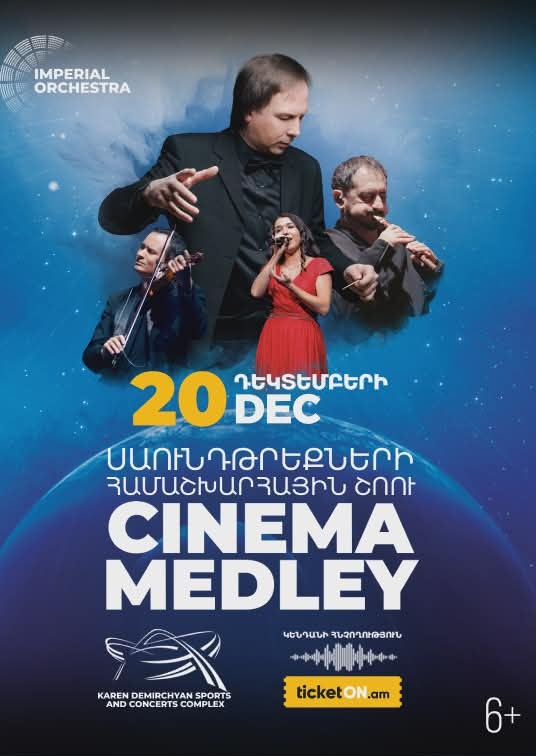 Վառ և ընդարձակ լուսավորություն, եզակի տեսողական նյութեր, գրավիչ էֆեկտներ. Imperial Orchestra-ն վերադառնում է Երևան իր լեգենդար Cinema Medley սաունդթրեքերի շոուով։ Դեկտեմբերի 20-ին «Իմպերիալ նվագախումբը» կրկին մեծ համերգ կտա Երևանի Կարեն Դեմիրճյանի անվան մարզահամերգային համալիրում։