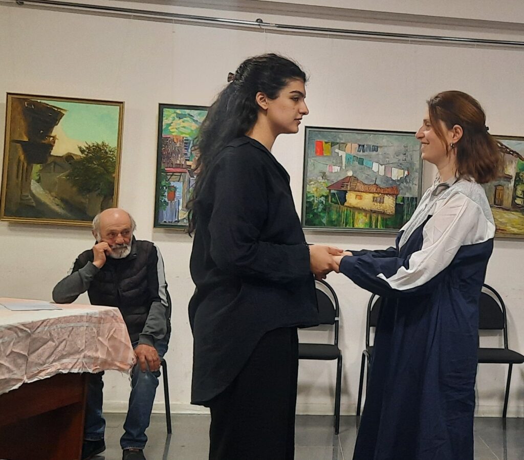 Պիեսի առանցքային կերպարներից մեկին՝ Առաքել պապին մարմնավորում է Վլադիմիր Միքայելյանը։ Նա աշխատել է Արցախի պետական դրամատիկական թատրոնում, երկար տարիներ զբաղեցրել վարչական պատասխանատու պաշտոն։ Նա խոստովանում է, որ Առաքելի դերը ստանալիս կասկածել է, որ այն կհաղթահարի։ «Դժվար առաջադրանք էր թվում դա ինձ համար,- ասում է,- սա բարդ հոգեբանական դեր է, հավաքական կերպար։ Ես շատ աշխատեցի դերի վրա, տիկին Կարինեին էլ շատ չարչարեցի։ Սպասենք վերջնական արդյունքին»։