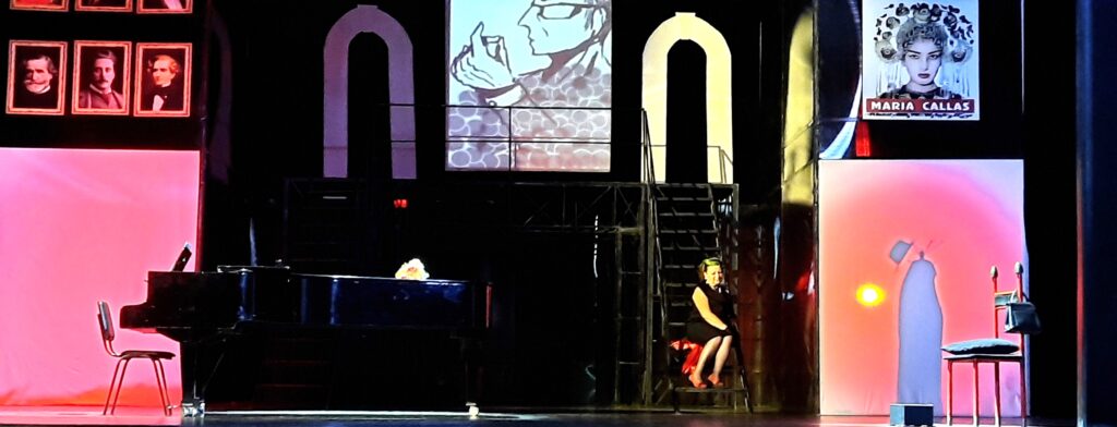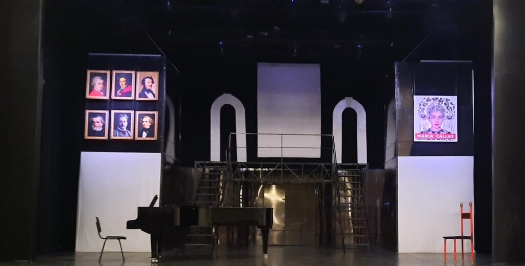 Բեմը ձևավորված է մինիմալիստական սկզբունքով: Այստեղ մեկ դաշնամուր է, մեկ աթոռ, մեկ աստիճան, մեկ միջնահարկ, երկու կամարների մեջ առնված էկրան, որի վրա երևակվում են ներկայացմանն անօրինակ շունչ հաղորդող անիմացիաները, համաշխարհային երաժշտության դասականների և բովանդակությամբ ու տեղորոշմամբ դրանցից առանձնացող Մարիա Կալասի նկարներ: